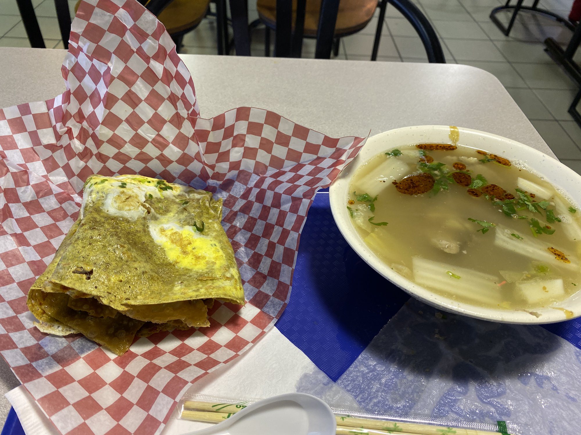 因为UA国际航线从加拿大出发比从美国出发便宜的缘故经常在YVR机场转机。这次找到了一家早餐店不错。名字叫“天津味 牛羊肉粉面” 英文名“O’Tray Noodle” 坐标在Aberdeen Plaza隔壁一幢看起来不怎么样的建筑。从机场有轻轨可以坐到Aberdeen Plaza步行几分钟就到。煎饼果子经天津的朋友远程图片鉴定表示质量不错。