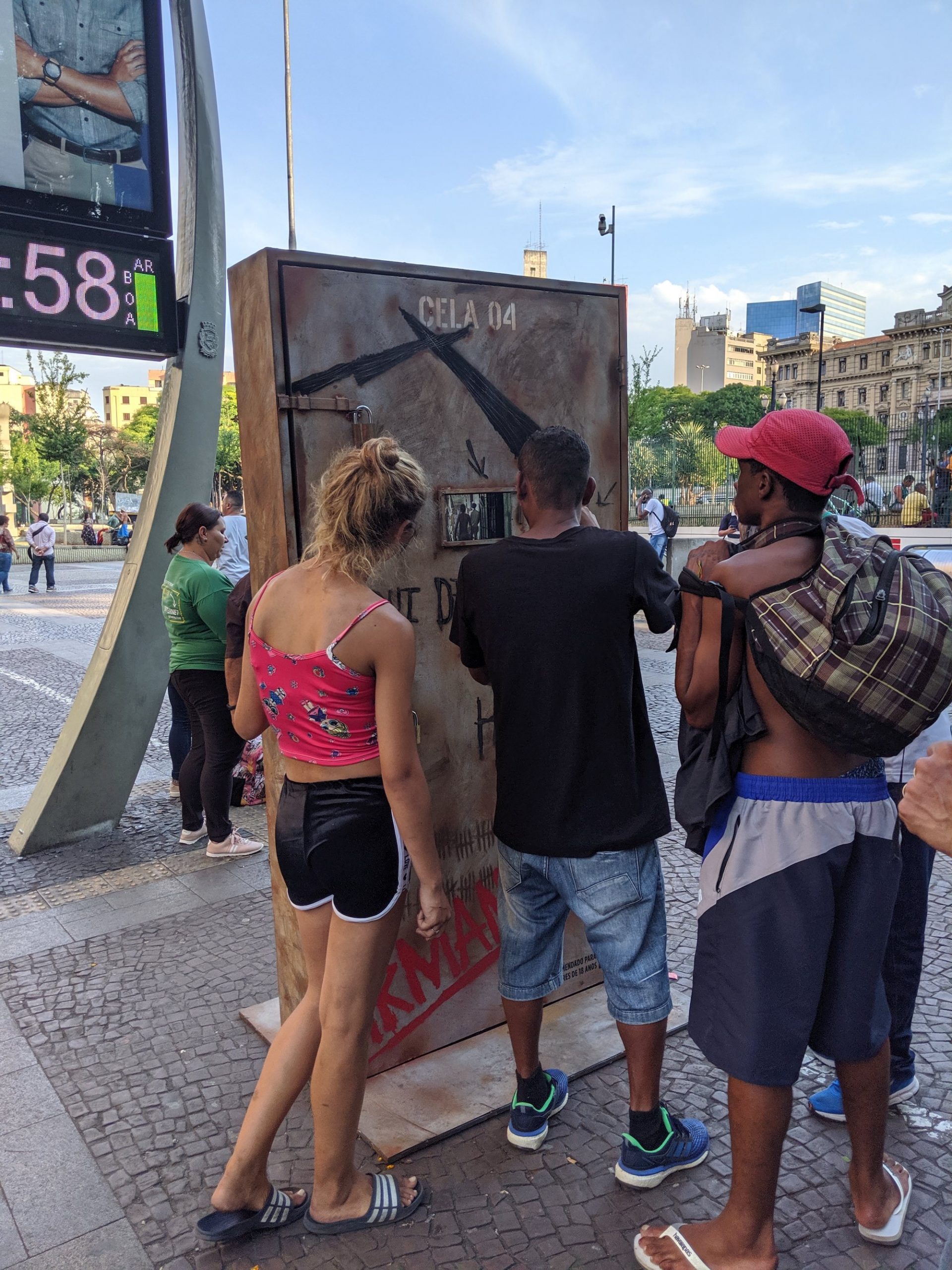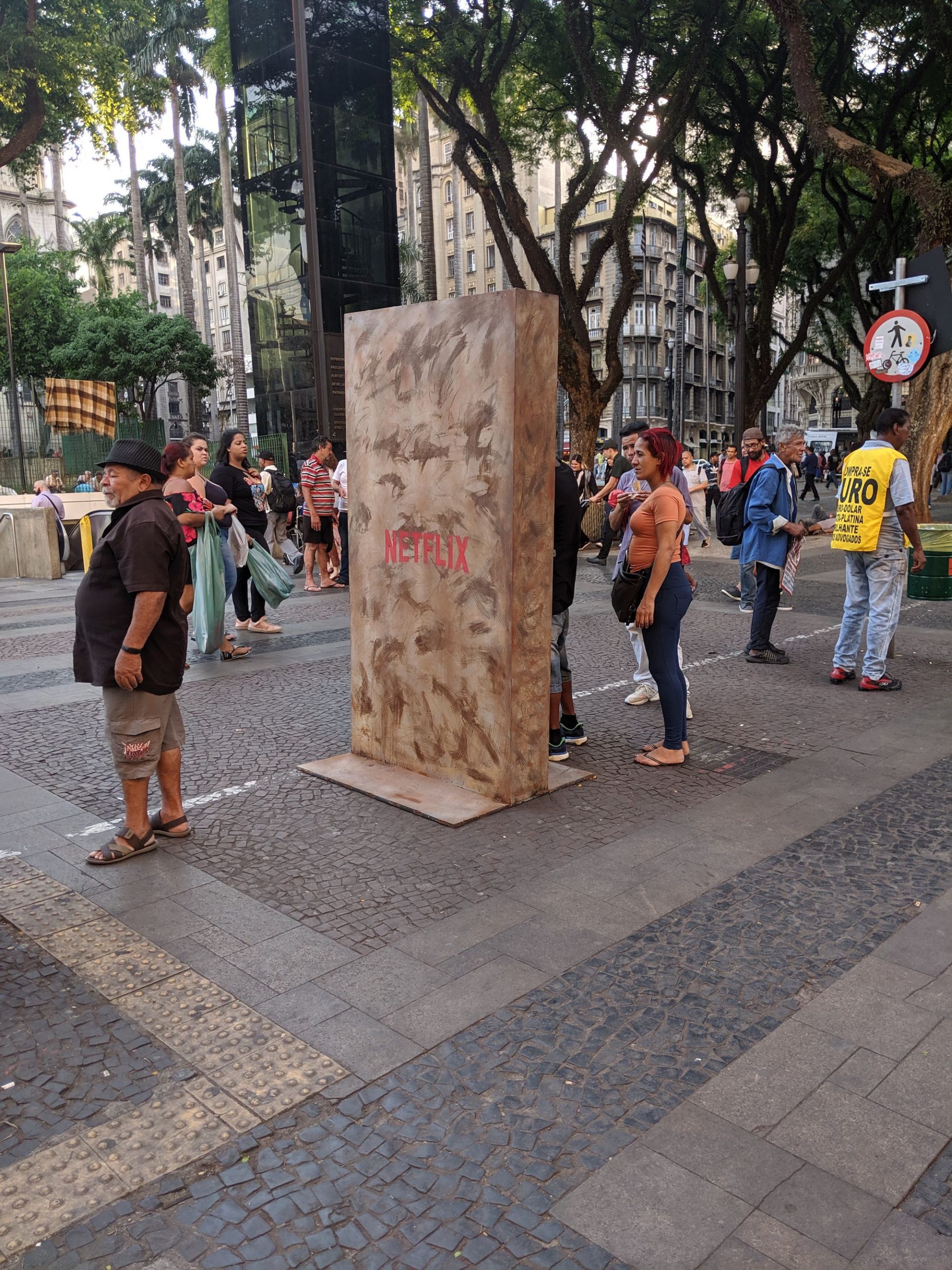 广场上还发现了很多人围着看一个木板钉起来的大箱子。研究了一圈后发现是Netflix在播放电视Trailer。别看箱体巨大实际屏幕也就比手机屏幕大不了多少。
